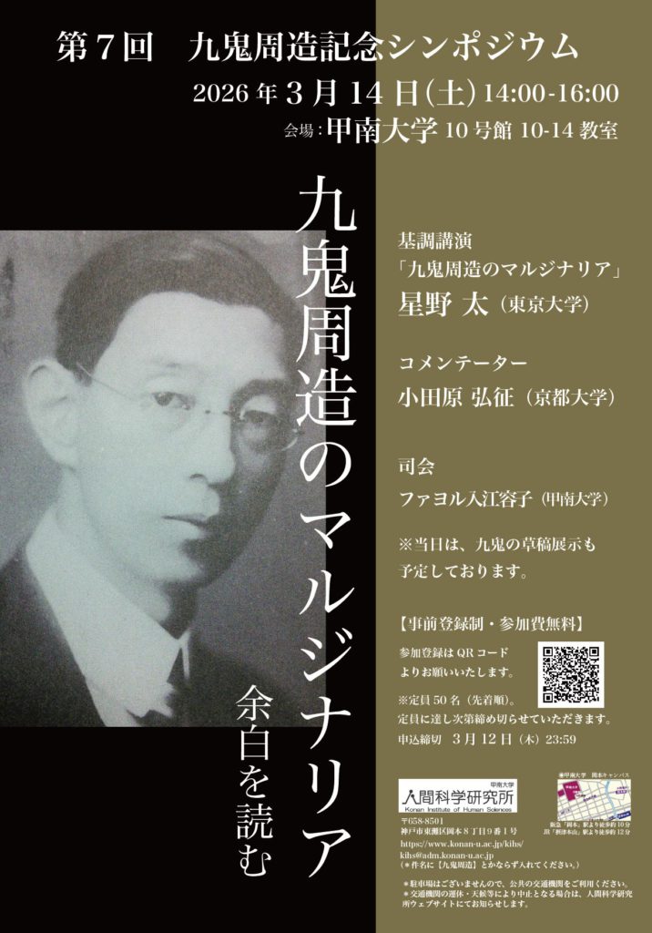 2026年3月14日(土)14時より、第7回九鬼周造記念シンポジウム「九鬼周造のマルジナリア――余白を読む」(会場:甲南大学 10号館10‐14教室)を開催いたします。