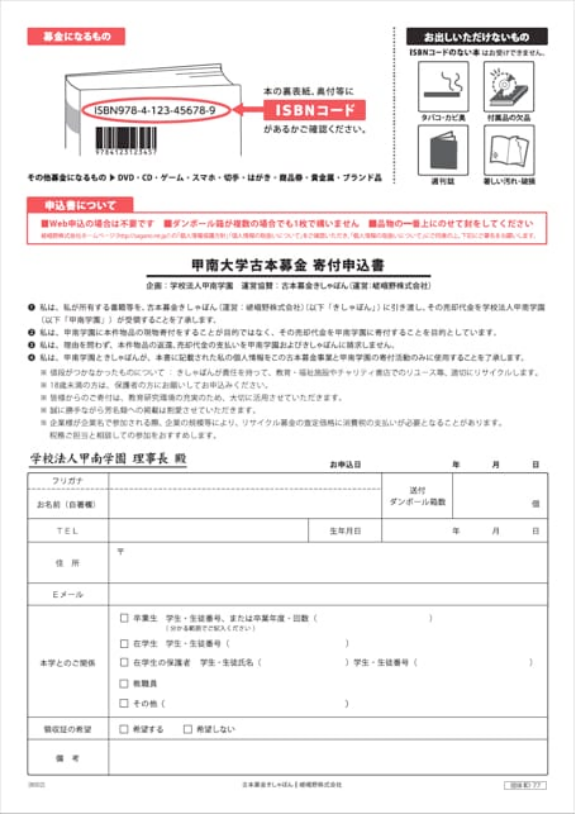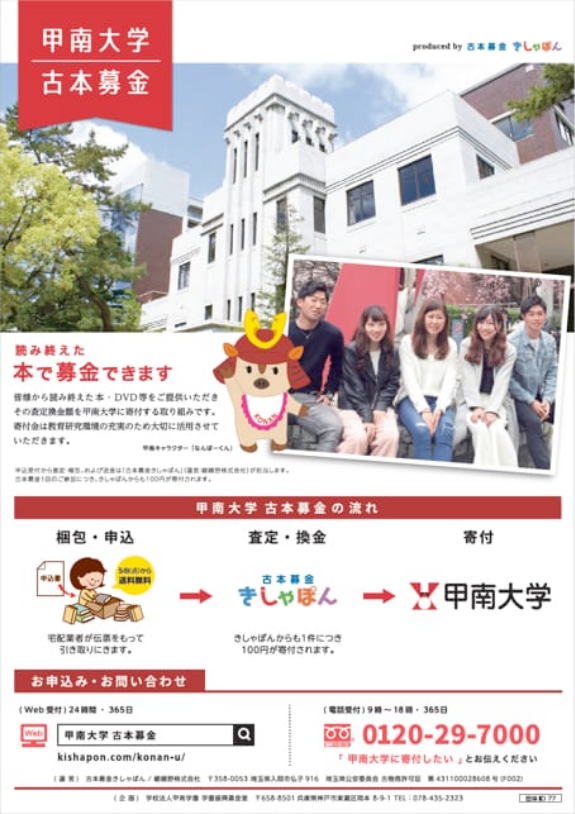読み終わった本・DVD 等をご提供いただき、その査定換金額を甲南大学にご寄付いただく取組みです。申込受付から査定・報告、および送金は「古本募金きしゃぽん」(嵯峨野株式会社)が運営を担当します。お申し込み1件につき、きしゃぽんからも100円が寄付されます。