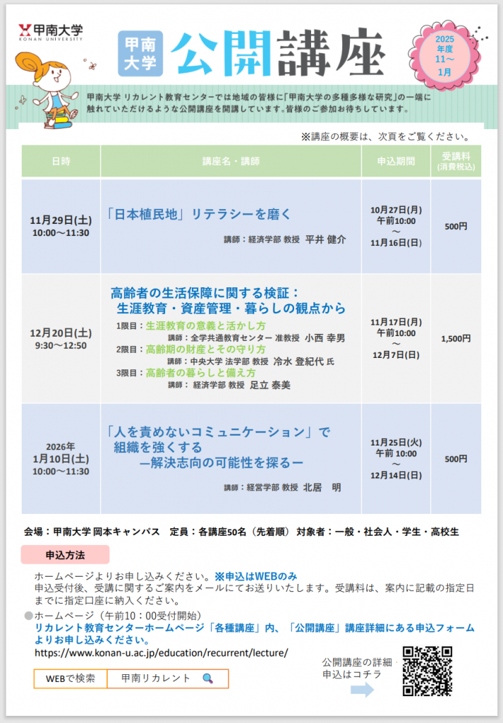 【受講生募集】(12/20)公開講座「高齢者の生活保障に関する検証:生涯教育・資産管理・暮らしの観点から」11月17日より申込受付開始!