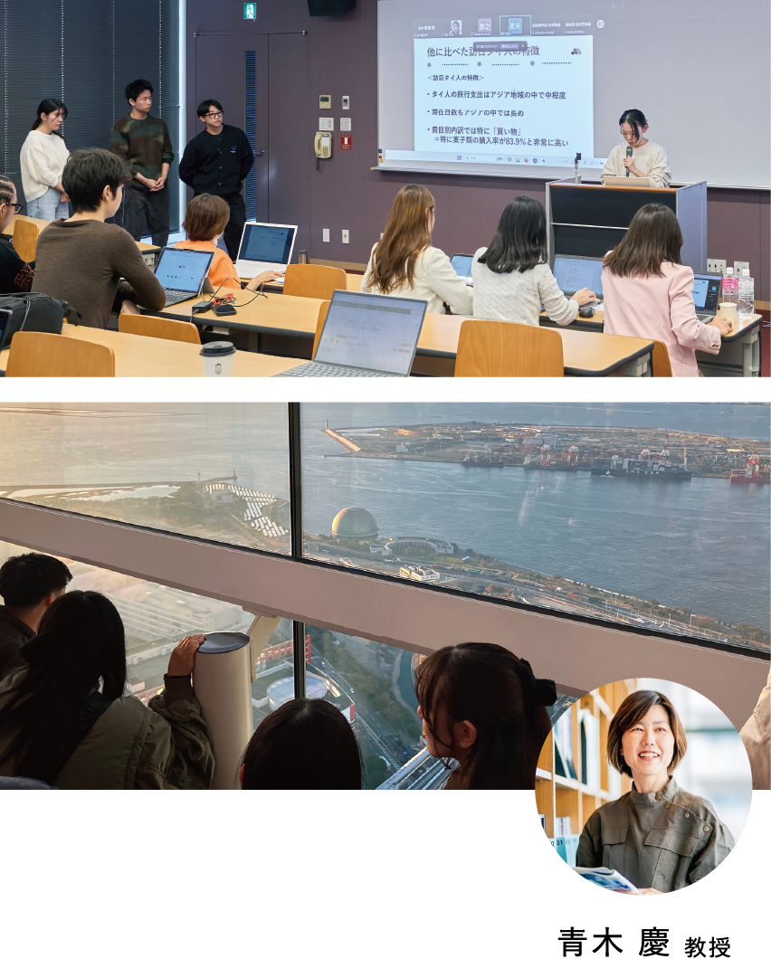 阪急阪神百貨店とのコラボレーションで、大阪・関西万博をきっかけに来日する外国人観光客に、日本の魅力を体感してもらうアイデアを考案。6チームそれぞれに、タイやインドネシアなど、担当するターゲットが決まっています。万博に携わるさまざまなゲストの講演を聞いたり、独自調査を実施したりして、ターゲットのニーズや困りごとを深く掘り下げました。また、企画の実施場所や、万博会場に近い大阪府庁咲洲庁舎に足を運んで、リアルに顧客体験をイメージしながら企画を練り上げました。特に苦労したのは宗教上の制限と、ビジネス性の確保でしたが、社員の方から何度もフィードバックを受けながら、「『スマホ』では見られない自然観光ツアー」「バーチャル書道の体験イベント」などのアイデアが生み出されました。いくつかのアイデアは、CUBE生も参画する形で具現化します。