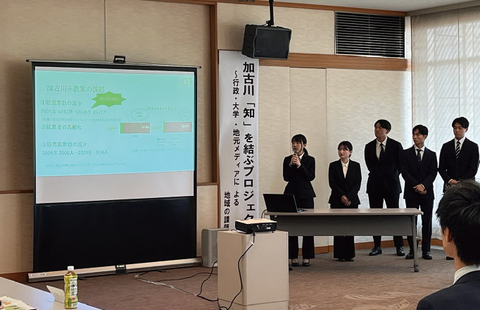 加古川市農林水産課から課題を伺い、農業振興を研究。トマト農家や営農組合にヒアリングを重ね「加古川野菜の認知向上」を岡田市長に提言。その後、学生が自主的に大学祭や地域マルシェに加古川産品の試食店を出展。行動力に驚かされました。