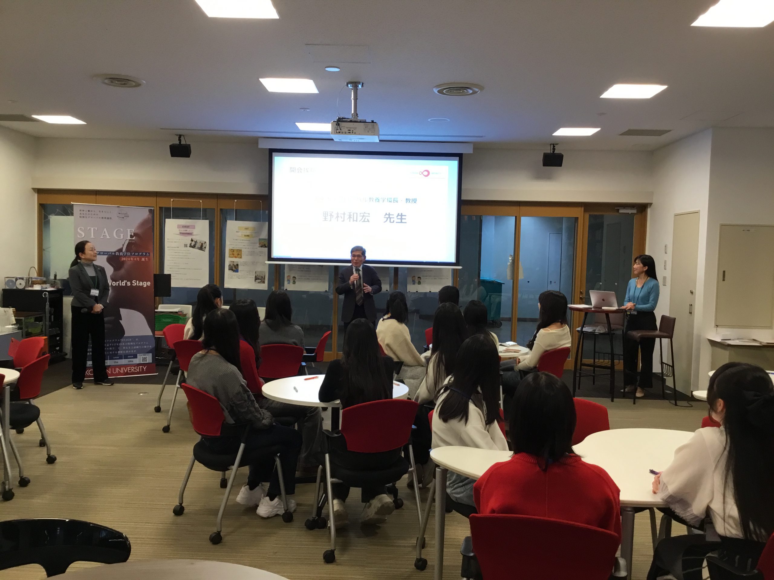 プログラムの冒頭では、野村和宏特命教授(グローバル教養学環長)によるご挨拶に続き、STAGE担当教員および先輩学生の自己紹介が行われました。新入生たちはやや緊張した様子でしたが、先生方のユーモアを交えた言葉や、先輩学生の明るく親しみやすいコメントに笑顔が広がり、会場は次第に和やかな空気に包まれていきました。