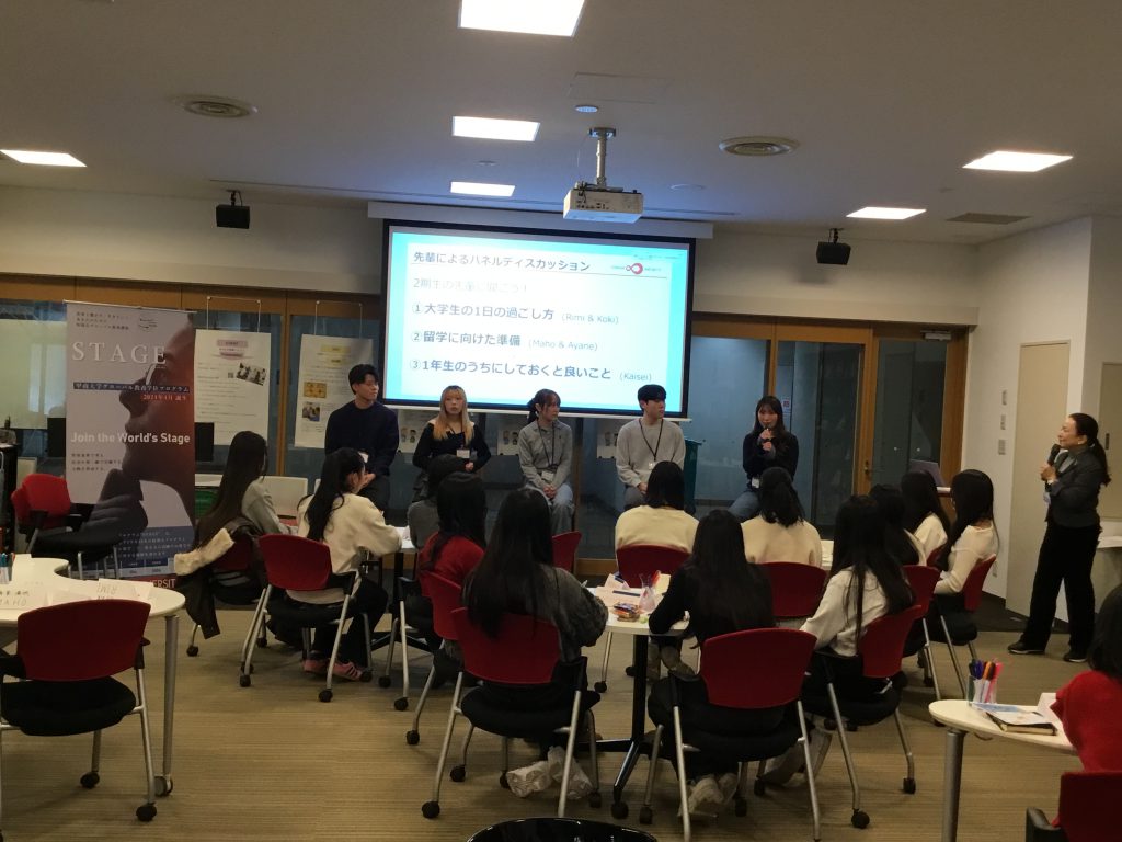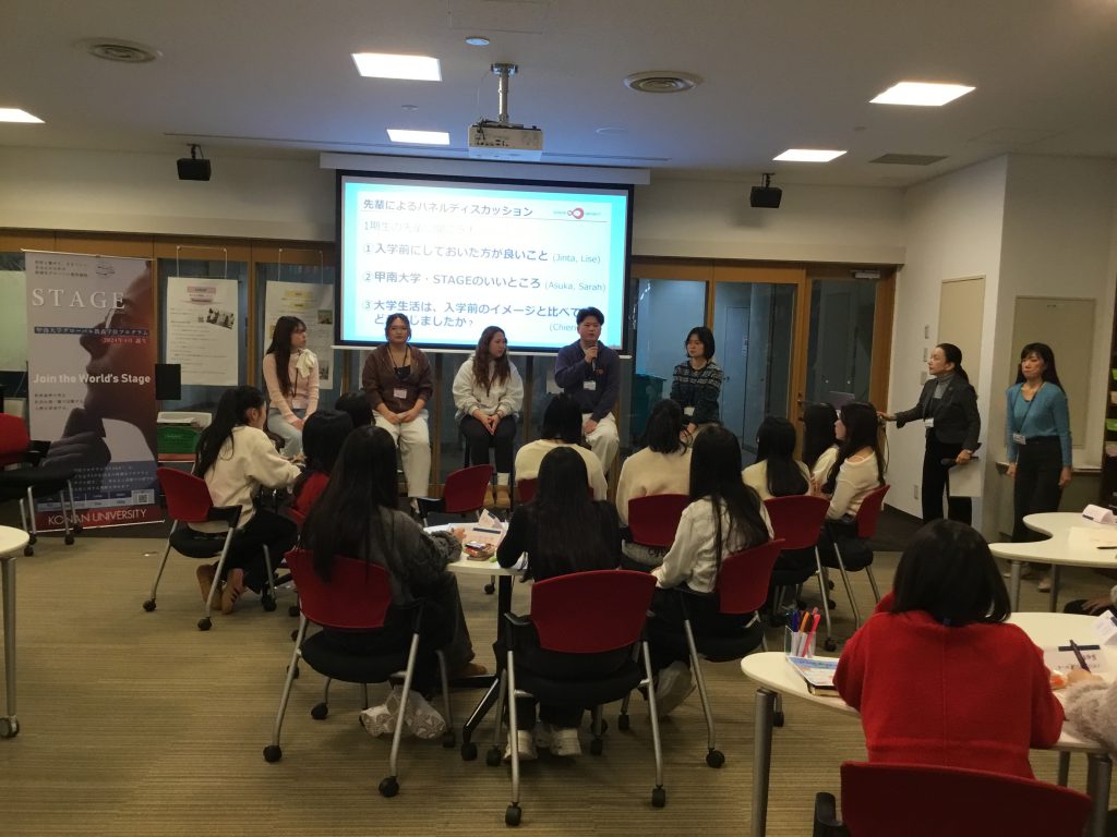 その後、先輩学生によるトークセッションが行われ、「甲南大学・STAGEの魅力」や「大学生活で意識しておくとよいこと」「実際にやってよかったこと」「留学準備で大切なポイント」などについて、在学生(1年生・2年生)それぞれの視点から語られました。新入生たちは、先輩学生のリアルな体験談に熱心に耳を傾けていました。