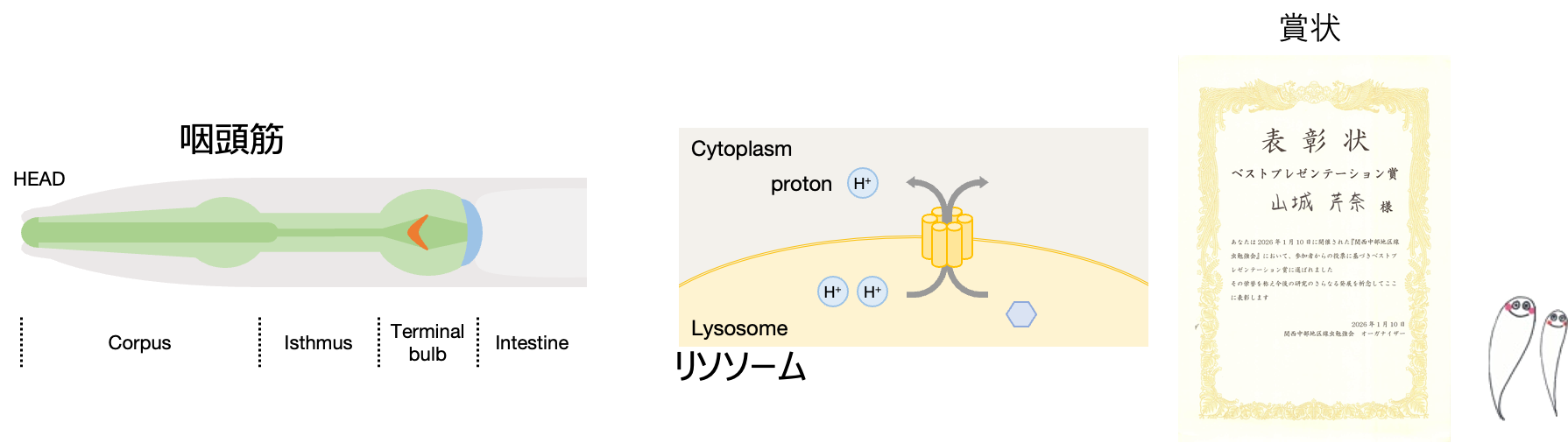 今回、山城 芹奈さんの「咽頭筋リソソーム銅トランスポーターは線虫の低温死を制御する」という線虫を使った研究内容の発表が対象となりました。