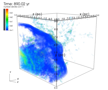 宇宙物理学の理論の分野で研究をしています。とりわけ超新星爆発のような現象で発生する衝撃波が引き起こす宇宙現象に興味を持っていて、それをコンピューター上に再現することで理論的に研究しています。衝撃波は地球上でも、爆弾が爆発した時や、戦闘機が超音速で飛行した時に発生することが知られています。宇宙で衝撃波が発生すると、例えば宇宙を漂っている水素ガスが衝撃波で押されて集まることで、次世代の星を生み出す分子雲と呼ばれる天体が形成されたりします。また、衝撃波の近傍では激しい磁気嵐が発生し、その影響でプラズマ粒子が加速され、宇宙線と呼ばれる超高エネルギーの粒子が発生したりもします。物理法則をうまくプログラミングできれば、これらの宇宙現象を実際の観測と見まがうほど正確に計算機上に再現することが可能になります。