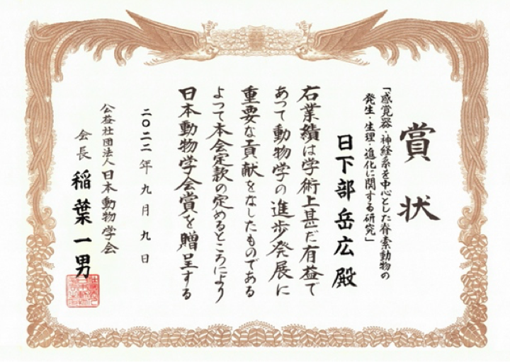 帰国後は、北海道大学、姫路工業大学、兵庫県立大学で教員をした後、2009年に甲南大学に着任しました。ホヤに加えて、新しい実験動物としてメダカも使っています。2022年に公益社団法人日本動物学会からこれまでの研究を認めていただき、日本動物学会賞を受賞しました。甲南大学で学生さんたちと一緒に行った研究が実を結んだ形です。