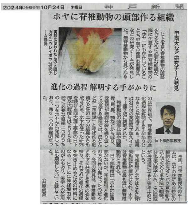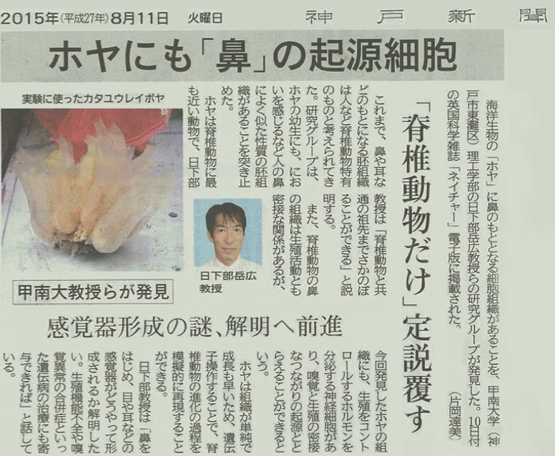 私たちは、ホヤが脊椎動物と同じタイプの眼の光センサー(視細胞)やニューロン(神経細胞)をもっていることを突き止めました。また、以前は脊椎動物にしかないと考えられていた、感覚器官や頭部の構造の元になる神経堤とプラコードという胚の組織がホヤにも存在することを明らかにしました。ホヤのプラコードの発見は2015年にNatureに論文を発表し、神経堤の発見は2024年に同じくNatureに論文を発表しました。これらの研究成果は、神戸新聞、朝日新聞、読売新聞、毎日新聞、日本経済新聞、産経新聞、共同通信、時事通信など多くのメディアに取り上げていただきました。