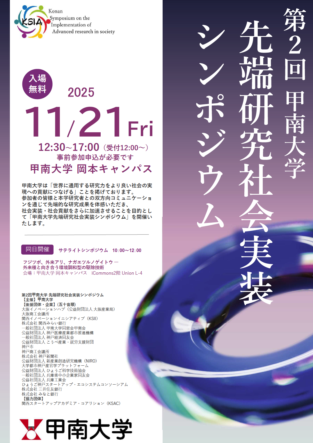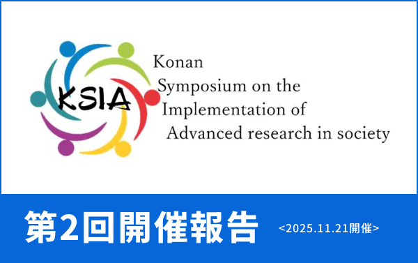 甲南大学フロンティア研究推進機構は、本学の先端的な研究成果を社会実装することを目的として活動しており、2023年度より「甲南大学先端研究社会実装シンポジウム ーKonan Symposium on the Implementation of Advanced research in society―(KSIA) 」を開催いたします。