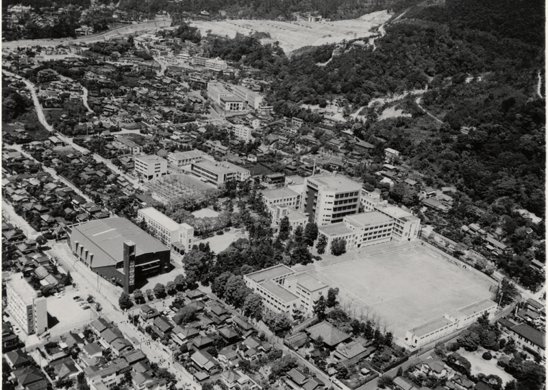 さて、甲南高等学校は、第2次大戦後の教育改革のなかで、将来、新制高等学校の道を歩むのか、それとも新制大学への昇格を目指すべきであるのか、という重大な選択の岐路に立たされました。理事、教職員、学生、同窓生らの間での活発な論議を経て、結局、後者の大学への道をとることになり、初代学長に、京都帝国大学から著名な物理学者で、かつて甲南高等学校の教授をしたこともある荒勝文策を招きました。そして、1951(昭和26)年の大学開学後、しばらくは、大学と高等学校・中学校が同一のキャンパス内にあって、大学生と中高生がともに校庭を行き来していました。学生・生徒の増加に対応するために、中学校校舎、高校校舎(現在の西校舎)が新しく建設されましたが、なお狭隘であることに変わりはありませんでした。そのため、1963(昭和38)年、高等学校・中学校は芦屋市に移転し、現在に至っています。