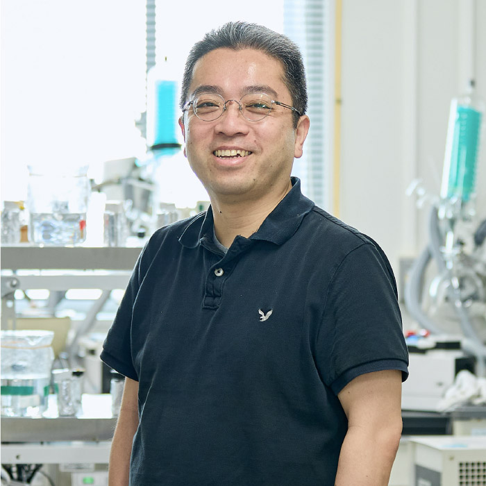 有機合成という手段を用いて、①新しい機能を持つ化合物の合成、②生命分子と有機分子の機能融合、③医療やバイオテクノロジーに利用可能なプローブの合成、④新規有機反応の探索、などを行っています。現在はガンの早期診断のための分子センサーに利用できる機能性色素や分子プローブを作っています。研究室での発見が少しでも社会の役に立つことを目標に研究に取り組んでいます。