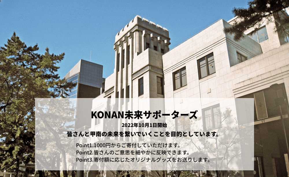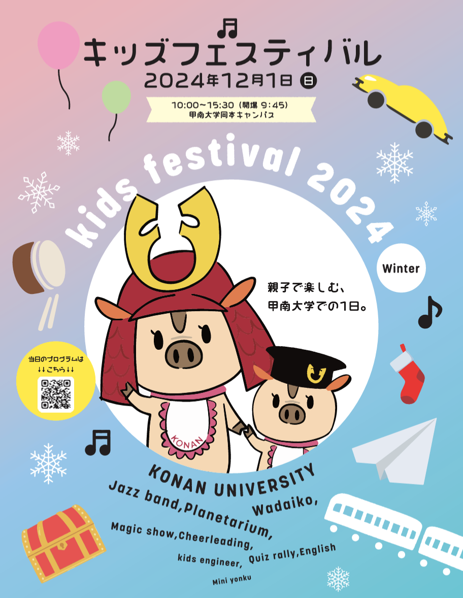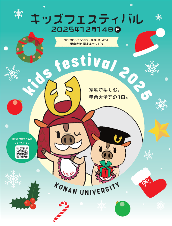 甲南学園100周年記念の一環として、岡本キャンパスに開設された複合施設「iCommons」を地域の方々にも体験いただき、甲南とのつながりを感じていただくために、2017年に初めて「甲南大学キッズフェスティバル」を開催しました。コロナ禍で開催を断念した時期を除いて毎年度開催し、2024年12月に開催した第5回のキッズフェスティバルでは、2,538名が来場される等、地域に愛されるイベントになっています。また、このイベントは、甲南大学の学生、教職員以外にも本学の取組みに共感、支援いただいた多くの企業、団体とのご協力によって実現しています。創立者 平生釟三郎が大切にした“共働互助”の精神で、キッズフェスティバルを通して、来場いただたいた子供達、ご家族、協力・ご支援いただく企業・団体との朗らかなつながりをこれからも大切にしていきます。甲南大学で笑顔の一日をお過ごしください。