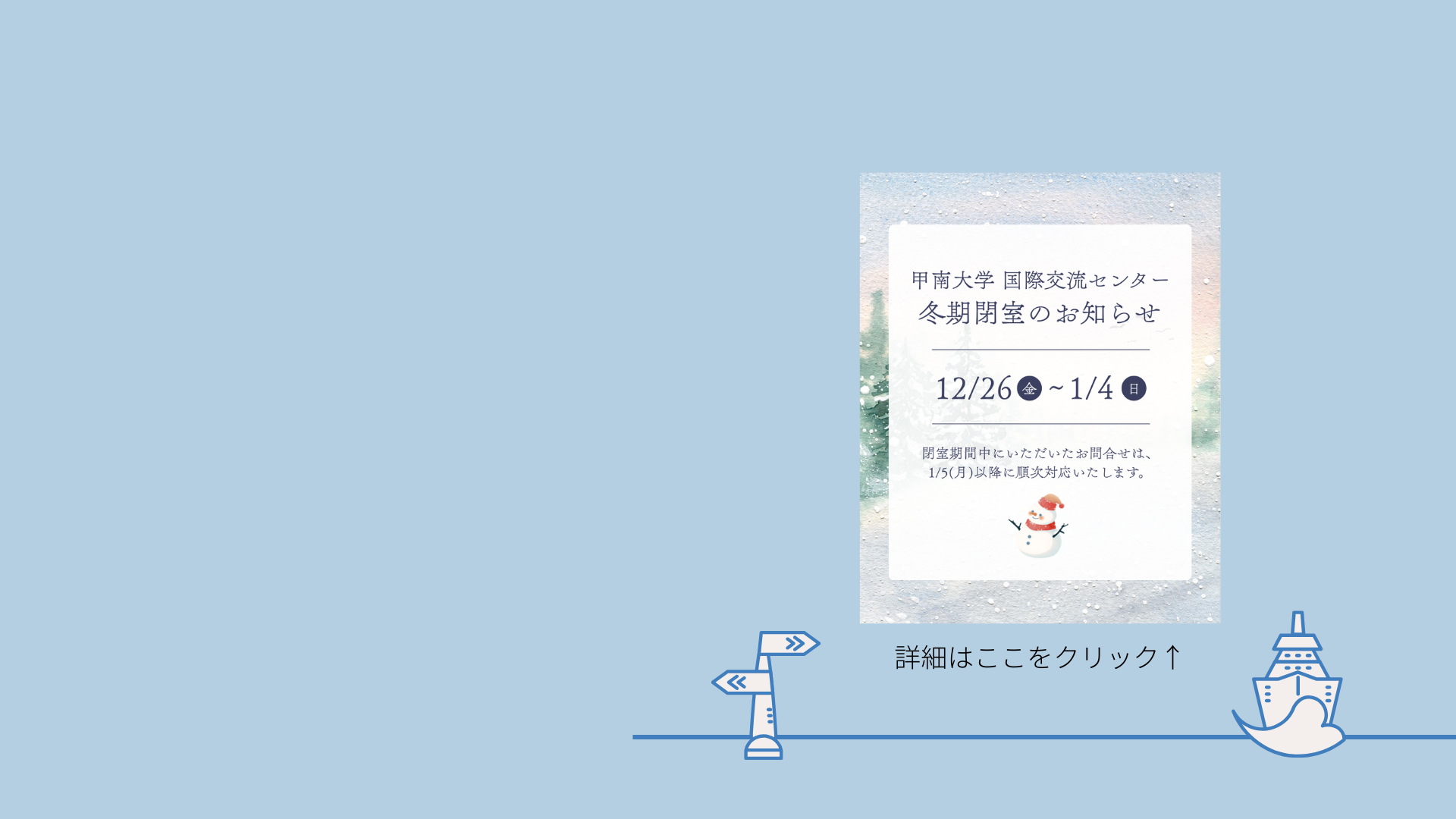 2025年度 KONAN グローバルサーティフィケイト募集要項 お知らせ 2025.12.23 公益財団法人 業務スーパージャパンドリーム財団 2026年度派遣留学奨学生募集の案内 奨学金 2025.12.22 2026年度 (一財)共立国際交流奨学財団 奨学金募集の案内について 奨学金 2025.12.22 (1/13)認定校留学説明会のお知らせ 外国留学 2025.12.22 【お知らせ】◆多文化共生を支える日本語教育人材育成の現状と課題―多様な教育現場と教師に求められる資質― 外部団体からのお知らせ 2025.12.19 冬期閉室期間のお知らせ お知らせ 2025.12.19 国際交流センター公式LINE グローバルサーティフィケイト KONAN Language LOFT 国際交流・留学スタイルから選んでみよう 国際交流・学内留学プログラム グローバルゾーン 短期留学 中長期留学 留学を計画する GLOBALな社会において日本にいても、地球のどこにいても、多様な価値観の中で広い視野をもって活躍することが求められています。 在学中にできる“リューカツ(留学活動)”プランを立ててみましょう。 留学プログラムを探す 在学中のプランを立てましょう。 学部での学習、課外活動、資格取得、進路設計、就職活動などのなかに、「留学」をどのように組み込んでいくか。 体験談 エリアスタディーズ カナダカナダ/バンクーバーコース エリアスタディーズ エリアスタディーズ ベトナムベトナムコース エリアスタディーズ 交換留学 フランスリヨン第三大学 協定校留学体験談