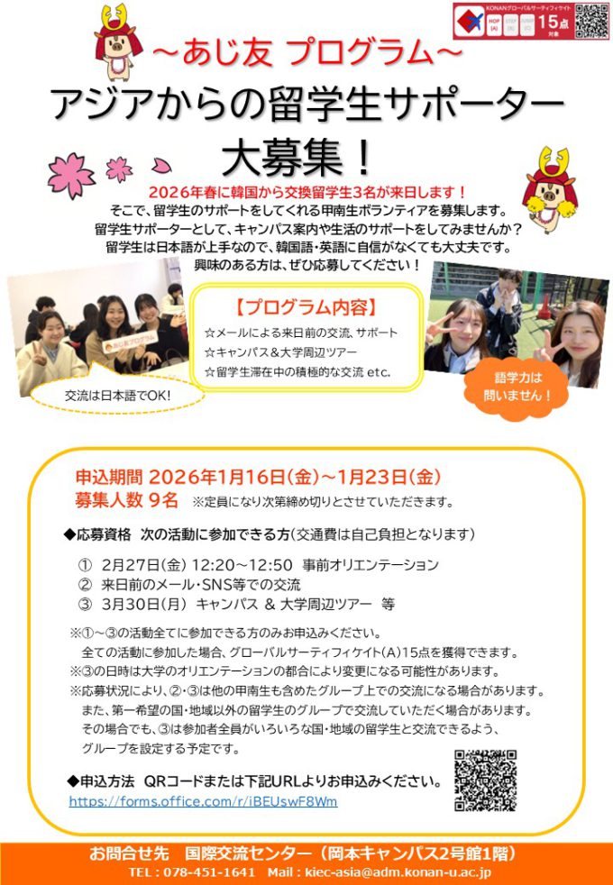 その留学生のサポートをしてくれる甲南生ボランティアを募集します。