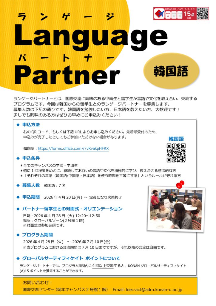 ランゲージパートナーとは、国際交流に興味のある甲南生と留学生が言語や文化を教え合い、交流するプログラムです。