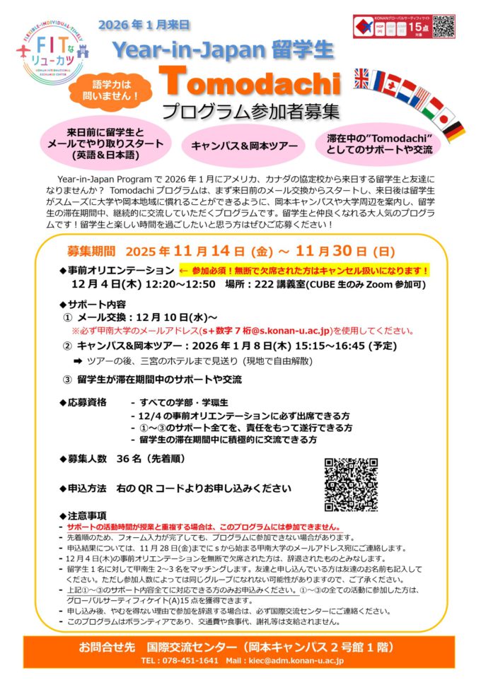 2026年1月にアメリカ、カナダの協定校から来日する留学生と友だちになりませんか?