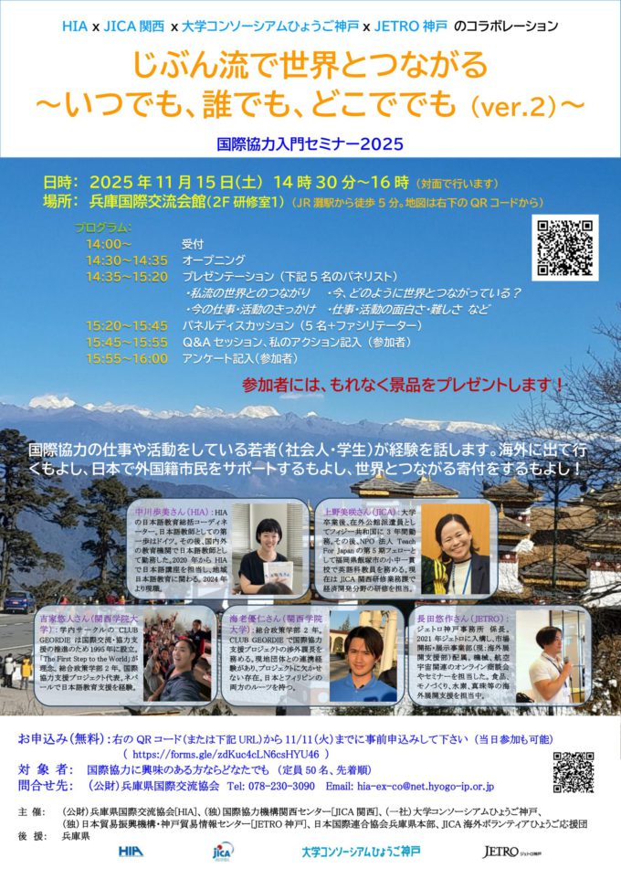 外部団体からのお知らせ 2025.10.28 【お知らせ】国際協力入門セミナー「じぶん流で世界とつながる~いつでも、誰でも、どこででも」 大学コンソーシアムひょうご神戸よりイベントの案内がありましたので、お知らせいたします。 詳細はポスターご確認ください。 ※このプログラムは甲南大学のプログラムではありません。 ※本件に関する質問等は、記載の連絡先に直接お問い合わせください。