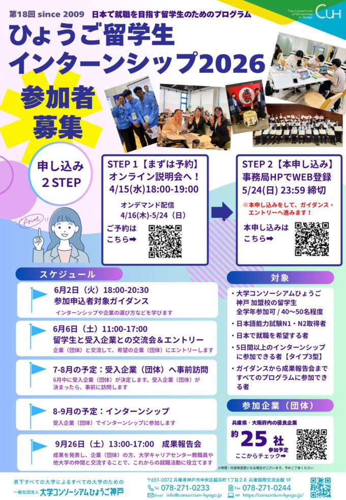 私たち「大学コンソーシアムひょうご神戸」は、留学生の皆さんの日本での就職を実現するため「ひょうご留学生インターンシップ」プログラムを実施します。