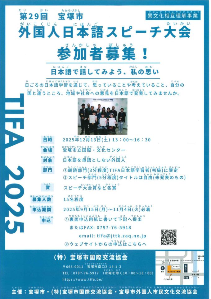 外部団体からのお知らせ 2025.9.30 【お知らせ】留学生対象:宝塚市日本語スピーチ大会 留学生対象のスピーチ大会についてのお知らせです。 興味のある方はぜひご参加ください。 ※このプログラムは甲南大学のプログラムではありません。 ※本件に関する質問等は、記載の連絡先に直接お問い合わせください。