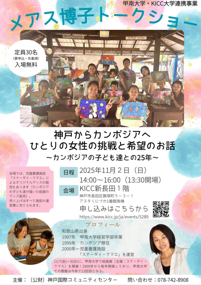 お知らせ 2025.10.27 【お知らせ】甲南大学卒業生トークショー 神戸国際コミュニティセンター(KICC)から、本学卒業生によるトークショーの案内が届きましたので、お知らせいたします。 詳細はポスターをご覧ください。