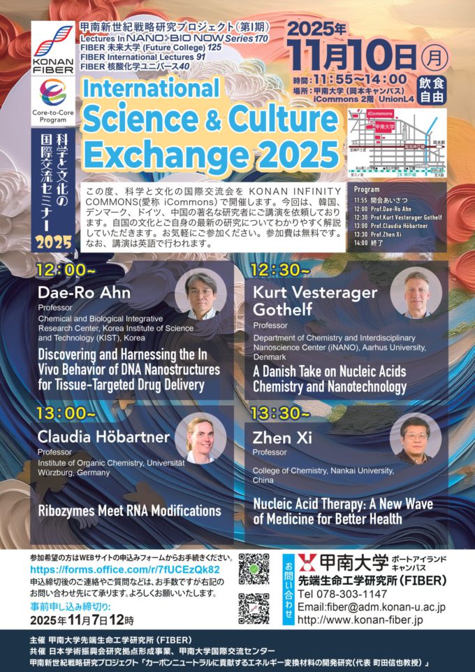 お知らせ 2025.10.27 【お知らせ】International Science&Culture Exchange 2025 International Science&Culture Exchange 2025 ・実 施 日:2025年11月10日(月) ・会 場:岡本キャンパスiCommons 2階 UnionL4 ・開 催 時 間 :11:55~14:00 イベントの詳細は、ポスターご覧ください。