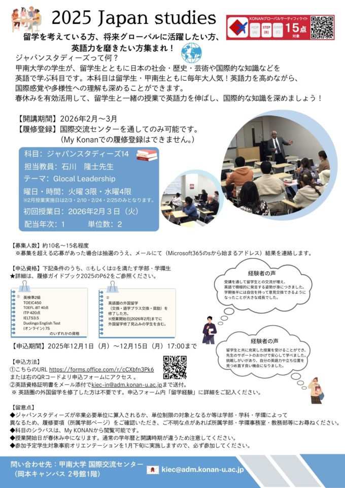 2026年2月から3月に開講される「ジャパンスタディーズ14」は、甲南生も留学生とともに履修することができます。