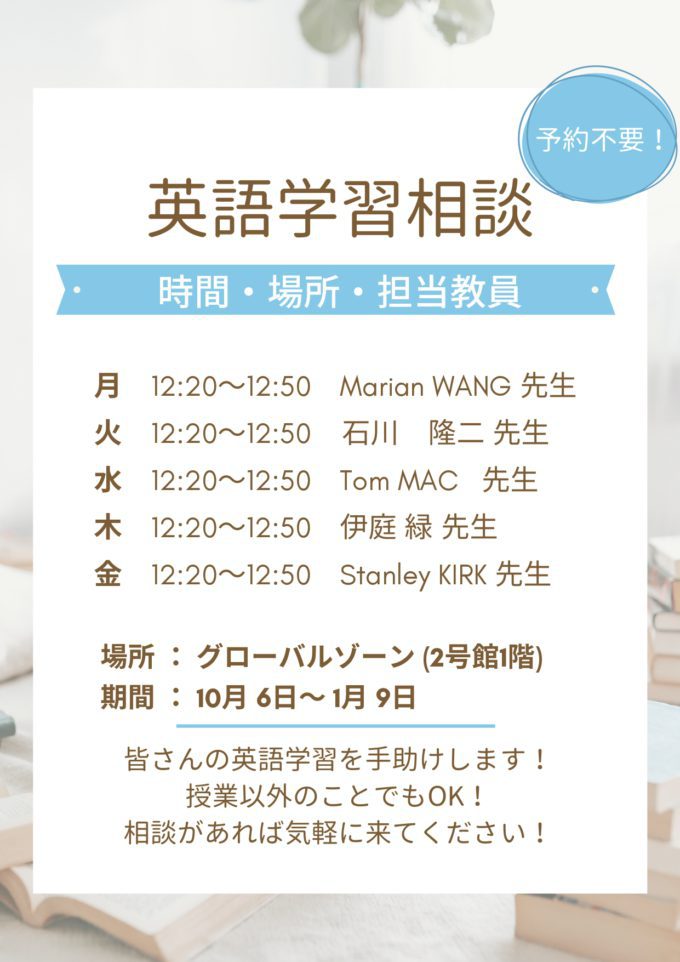 Konan Language LOFT 2025.10.10 英語学習相談@グローバルゾーン<10/6(月)~1/9(金)> 全学共通教育センターの英語教員が、お昼休みに みなさんの英語学習を手助けします! 【2025年度後期 実施期間】10月6日(月)~1月9日(金) 英語の学習について何か困っていることや、 相談がある方は、お気軽にグローバルゾーン(2号館1階) までお越しください!予約は不要です! 曜日ごとの担当教員、実施時間などの詳細は ポスターをチェックしてください↓