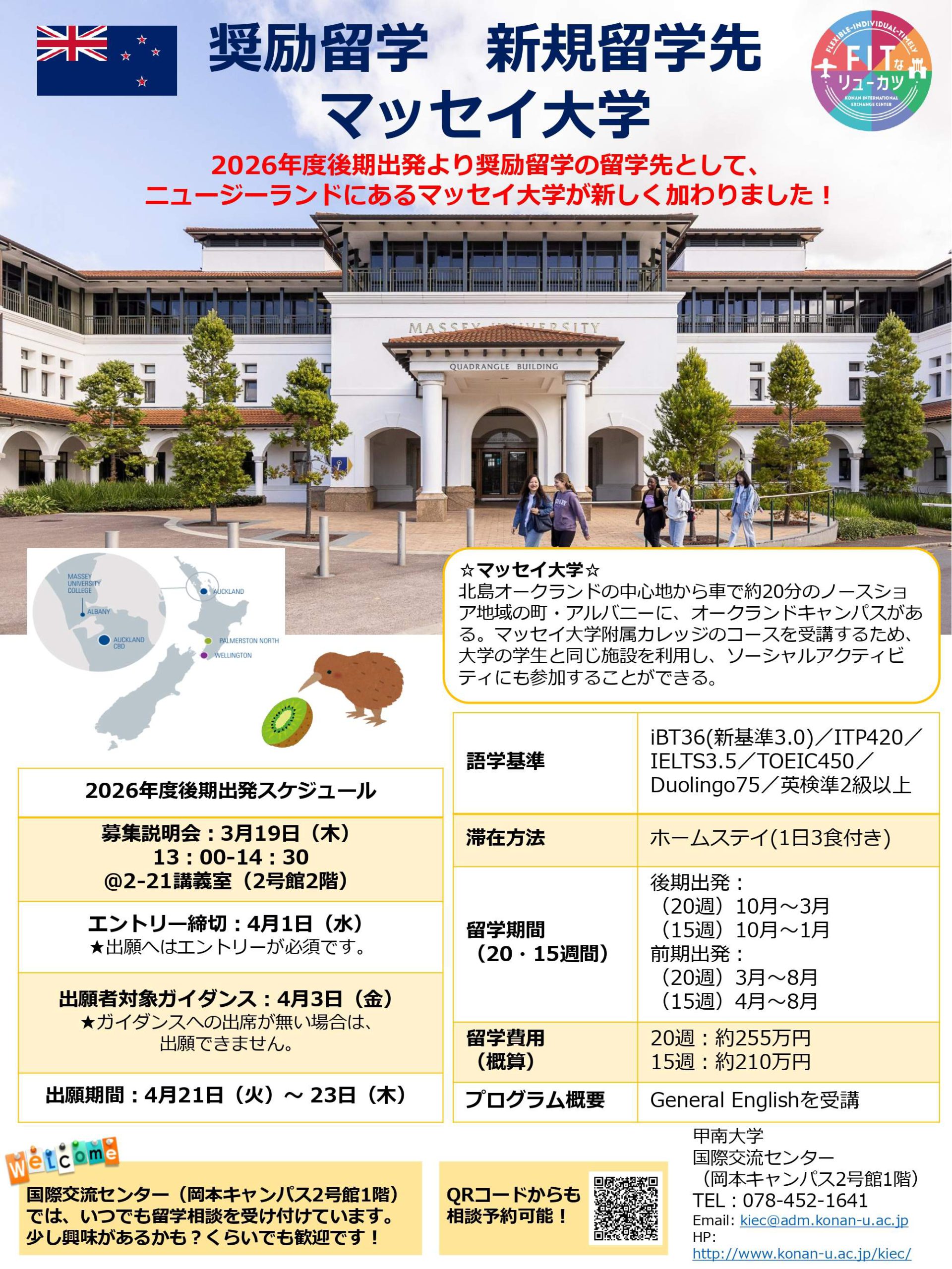 2026年度後期出発より奨励留学の留学先として、ニュージーランドにあるマッセイ大学が新しく加わりました!