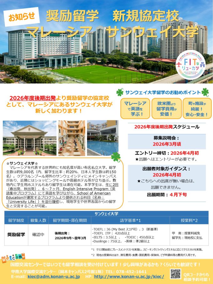 マレーシアのサンウェイ大学で、英語を学ぶ奨励留学生(2026年度後期出発)を2026年3月より募集開始する予定です。