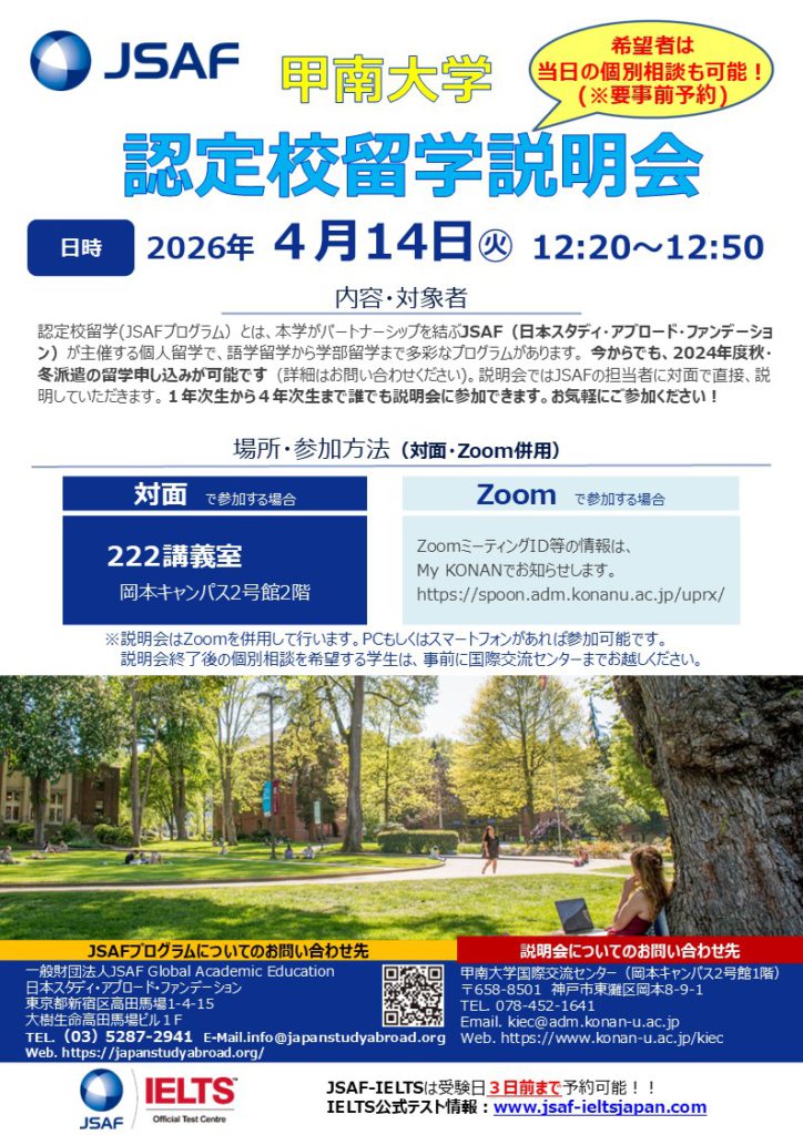 認定校留学(JSAFプログラム)とは、本学がパートナーシップを結ぶJSAF(日本スタディ・アブロード・ファンデーション)が主催する個人留学で、語学留学から学部留学まで多彩なプログラムがあります。 現在、2026年度秋・冬派遣の留学申し込みが可能です。