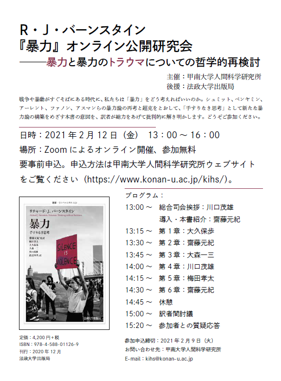 戦争や暴動がすぐそばにある時代に、私たちは「暴力」をどう考えればいいのか。シュミット、ベンヤミン、 アーレント、ファノン、アスマンらの暴力論の再考と超克をとおして、「手すりなき思考」として新たな暴力論の構築をめざす本書の意図を、訳者が総力をあげて批判的に解き明かします。どうぞご参加ください。