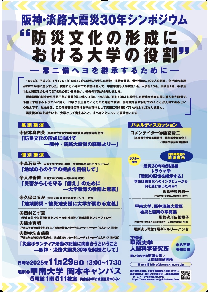 2025年11月29日に甲南大学人間科学研究所で開催いたしました、阪神・淡路大震災30年シンポジウム「 防災文化の形成における大学の役割 : 常ニ備ヘヨを継承するために」の記録DVDが「甲南大学図書館」と「人と防災未来センター資料室」に収蔵されました。