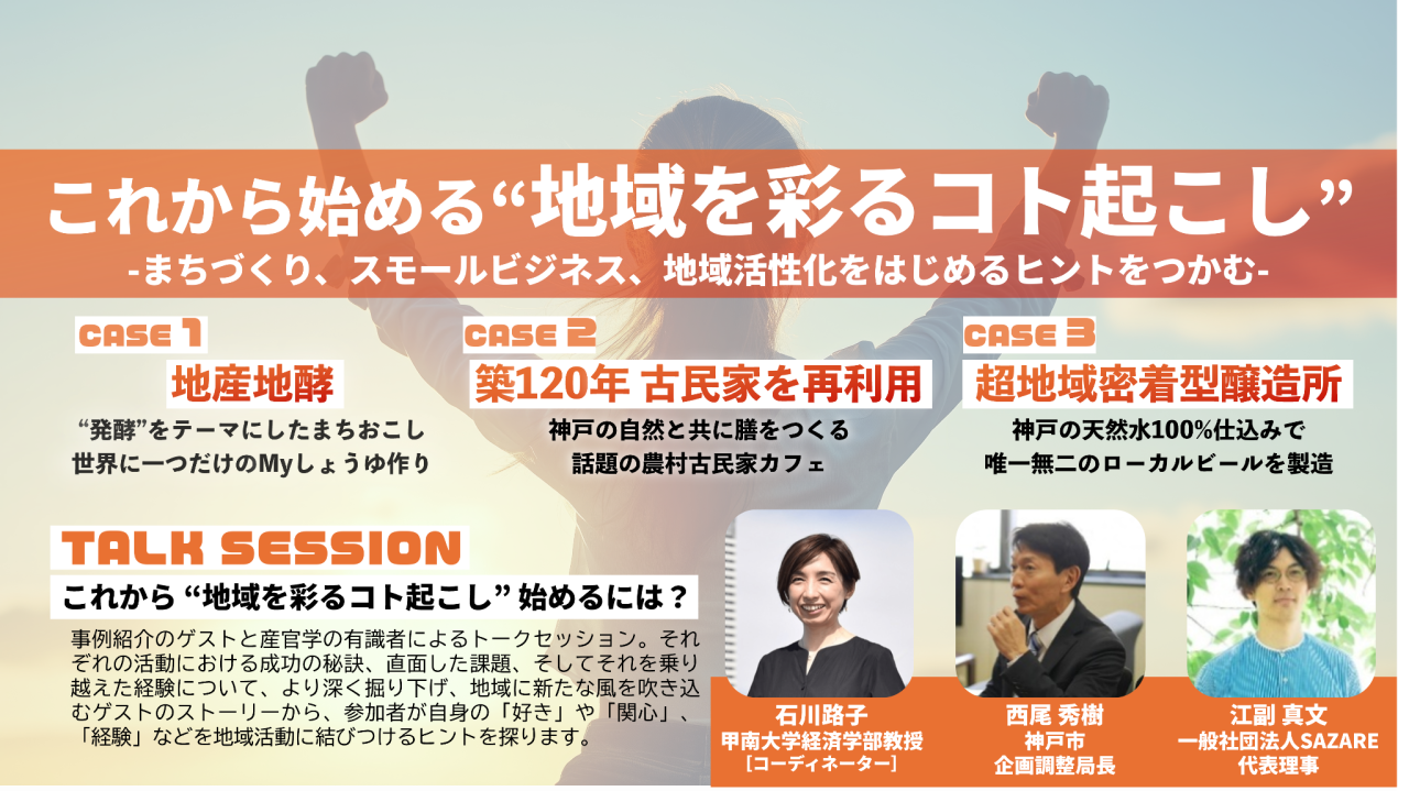 「地域に貢献したい」「仕事とは別に何か始めてみたい」と思っても、不安を感じて踏み出せない方もいるでしょう。本トークセッションでは、兵庫・神戸で“地域を彩るコト起こし”(地域の魅力を引き出し、暮らしを豊かにする活動)に取り組むゲストを迎え、その一歩の踏み出し方や想いを紐解きます。
