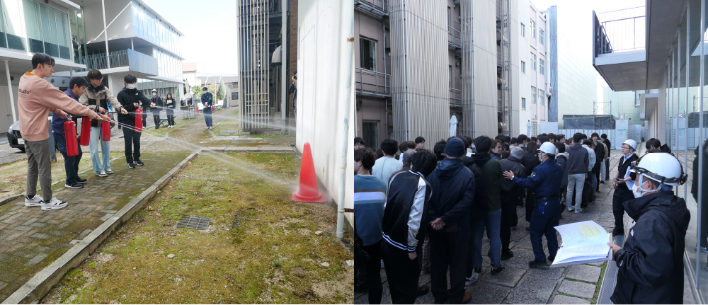 阪神・淡路大震災の経験を未来へ伝えるべく、甲南大学では創立者・平生釟三郎の言葉「常に備えよ」を実践し、毎年、学生と教職員を対象に避難訓練を実施しています。昨年11月に実施した訓練では、震度6弱以上の地震発生を想定した避難訓練と、水消火器の使用体験を行うとともに、留学生を含めた安否確認の訓練配信や災害対策本部における情報収集等の発災直後の初動対応について確認を行いました。学生たちは訓練を通じて、防災意識を高めるとともに、震災の記憶を未来へ伝える重要性を学んでいます。今後も、被災を経験した学園として今後も防災に関する取り組みを進めてまいります。