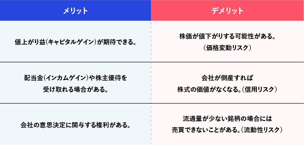 一般的に、株式投資の最大の魅力は「値上がり益(キャピタルゲイン)」と言われています。株価が安いときに購入し、値上がりしたあとに売却すればその差額が利益になります。しかし、デメリットにもある通り、株価が値下がりする可能性(価格変動リスク)があります。また、「必ず値上がりする会社」を見つけることは至難の業と言えます。そこで今回は、会社によっては株主に自社製品や優待券などを提供する「株主優待制度」を使った株式投資ならではの楽しみを紹介いたします。