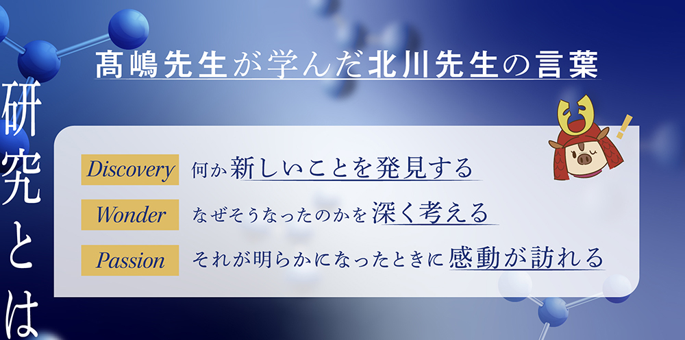 今でも印象に残っているのですが、北川先生は研究の流れを3つの単語で表現されていました。それが、Discovery、Wonder、Passionです。何か新しいことを発見したら、そこで止まるな。研究は最初の発見という喜びがあり、一生懸命に試行錯誤して、それが何か分かったときの感動がセットで感じられる。それが研究の魅力であり楽しさであり、面白さでもあると、北川先生から学びました。