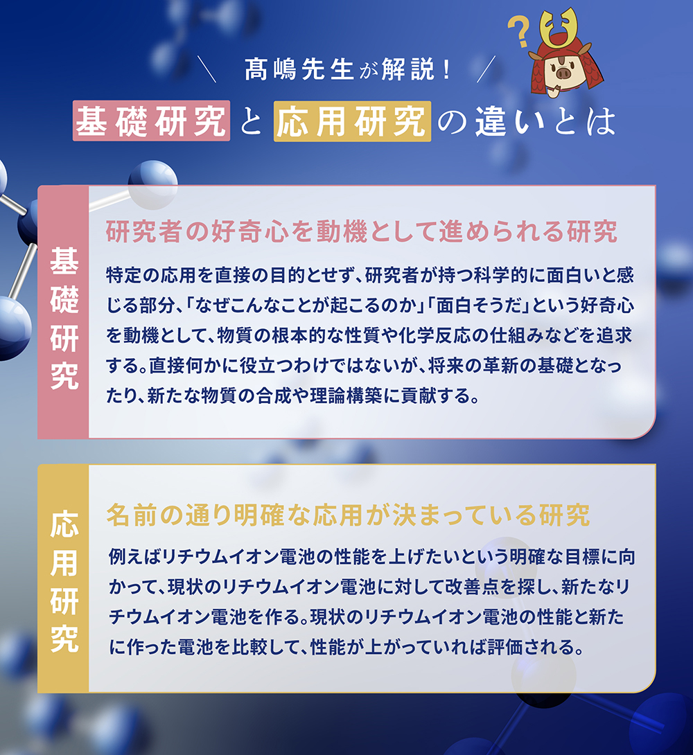 髙嶋先生:研究というのは、思った通りに行くのも嬉しいものですが、想像しないことが起こるのもとても面白い。それを突き詰めていく面白さを北川研で学びました。特に基礎研究というのは、単純に研究者の好奇心からやるようなものが多い。一方で、大学の研究は社会的なニーズもあり、最近はどちらかというと応用研究が重視される流れがあります。そうした中で、今回ノーベル賞を受賞した二人の先生は、科学の発展のためには基礎研究のサポートが必要だと言われています。僕も、そこを大事にしていかなければと思いますし、そこに本当の研究の面白さがあると思っています。