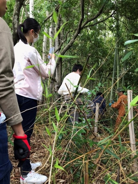 現地活動では、高校生に放置竹林の現状や実際に竹林で竹を伐採し運びだす苦労を知ってもらうことで、なぜ放置竹林が問題となっているのか、継続的な竹林整備が必要となるのかについて肌で感じてもらうことができました。