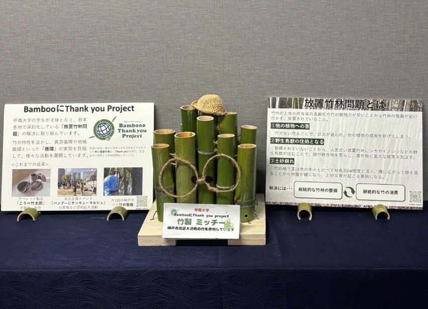 私たちが商品化した「こうべ竹太郎」(詳細:https://www.konan-u.ac.jp/korec/news/report/【放置竹林問題に取り組むbambooにthank-youプロジェクト】-11)の商品開発にご協力いただいた株式会社YTE様を通じ、ガスパビリオンの担当者さまが私たちの活動に関心を寄せてくださり、今回の展示につながりました。一般のお客様が入れない場所ではありますが、今後の活動へ広がる重要な機会となりました。