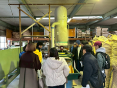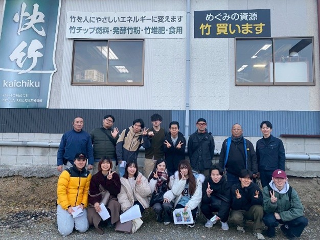 最後に、「杉本林業株式会社」では、竹の加工(竹チップ・竹パウダー等)と農業利用の事例を学びました。「ウェルネスパーク五色」の竹チップ燃料は、杉本林業から提供されています。バンブーカッターを導入するなど、竹加工の採算性向上に努めておられ、地域資源である竹の利活用の拡大に取り組んでおられます。竹パウダーは土壌改良材として根菜類を中心に効果が出やすく、収量向上などの可能性が示された一方、在庫が積み上がりやすく販路拡大が不可欠であること、加工機器を維持するには継続的な稼働と“出口”づくりが重要であることを実感しました。