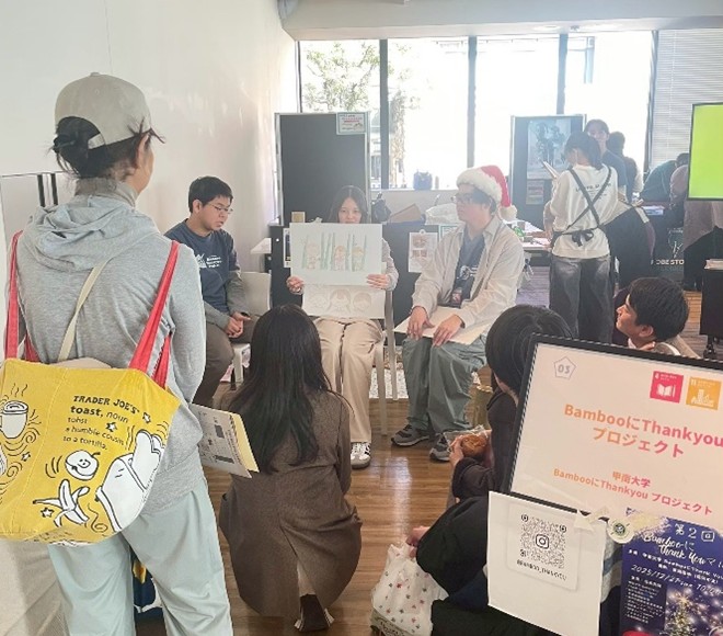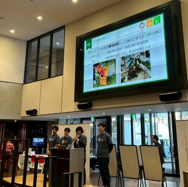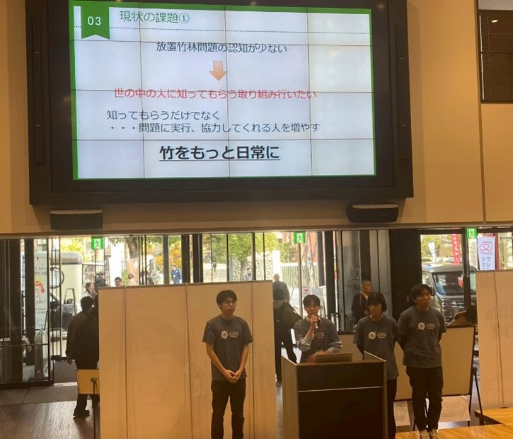 私たちはこの場で、環境問題に関心を持つ多くの学生や地域の方々に放置竹林問題の現状や背景について理解を深めていただくことを目的に出展しました。