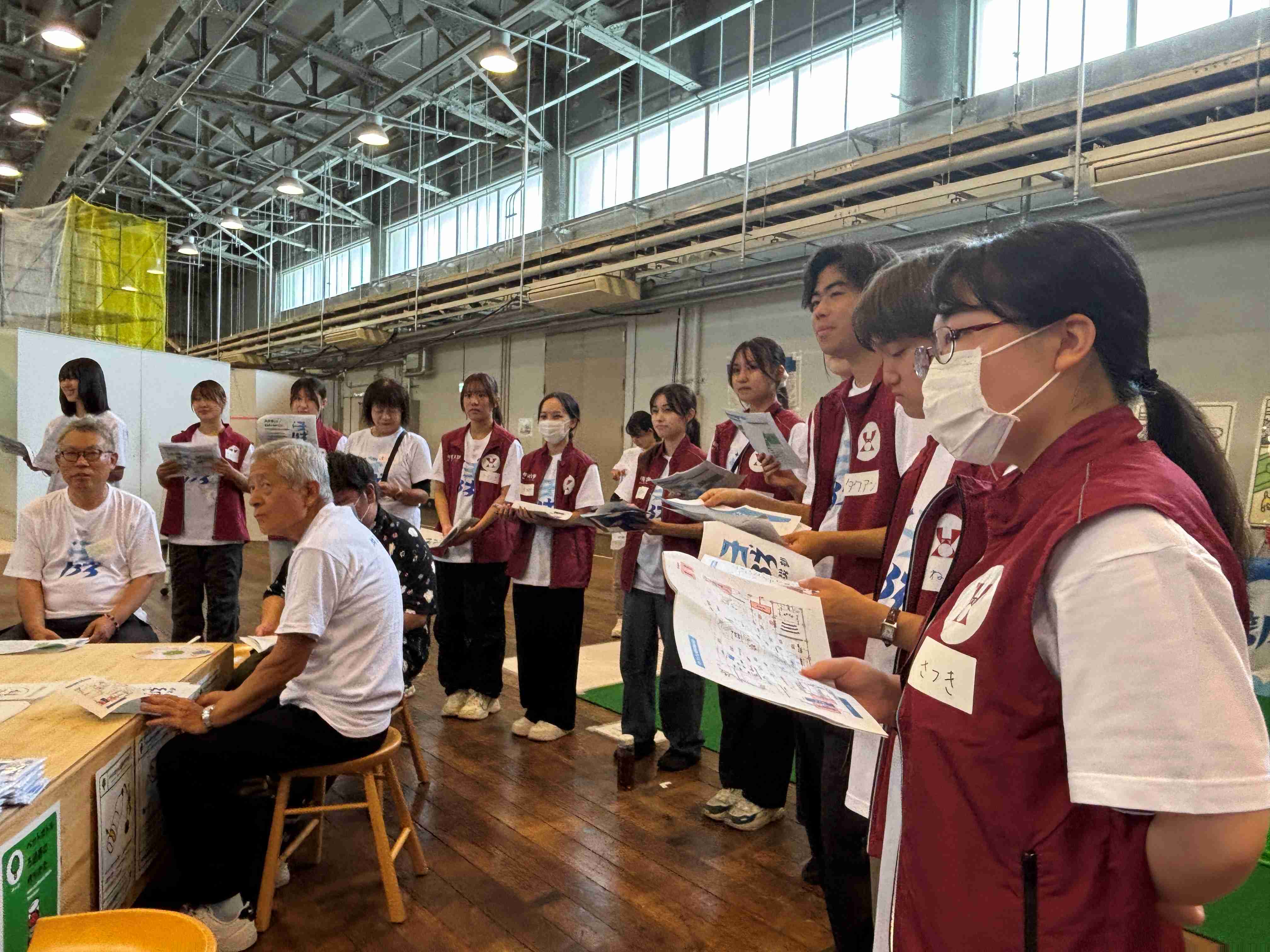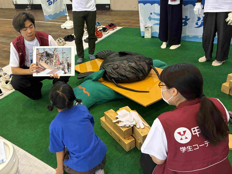 イベント当日は、7名の甲南大生が参加しました。来場者が楽しく防災プログラムを体験できるようにボランティアとして運営をサポートします。具体的には、体験ブースの案内や他のボランティア参加者との交流、運営スタッフとの連携などを担います。来場者をサポートするボランティアは、来場者以上に防災について深く理解することが求められます。初めての活動で緊張している学生もいましたが、安心して活動に取り組めるように、なんティアメンバーが積極的に声をかけてサポートすることを心掛けました。来場者はもちろん、ボランティアにとっても、防災の大切さや地域での備えについて考える機会を提供できたと思います。