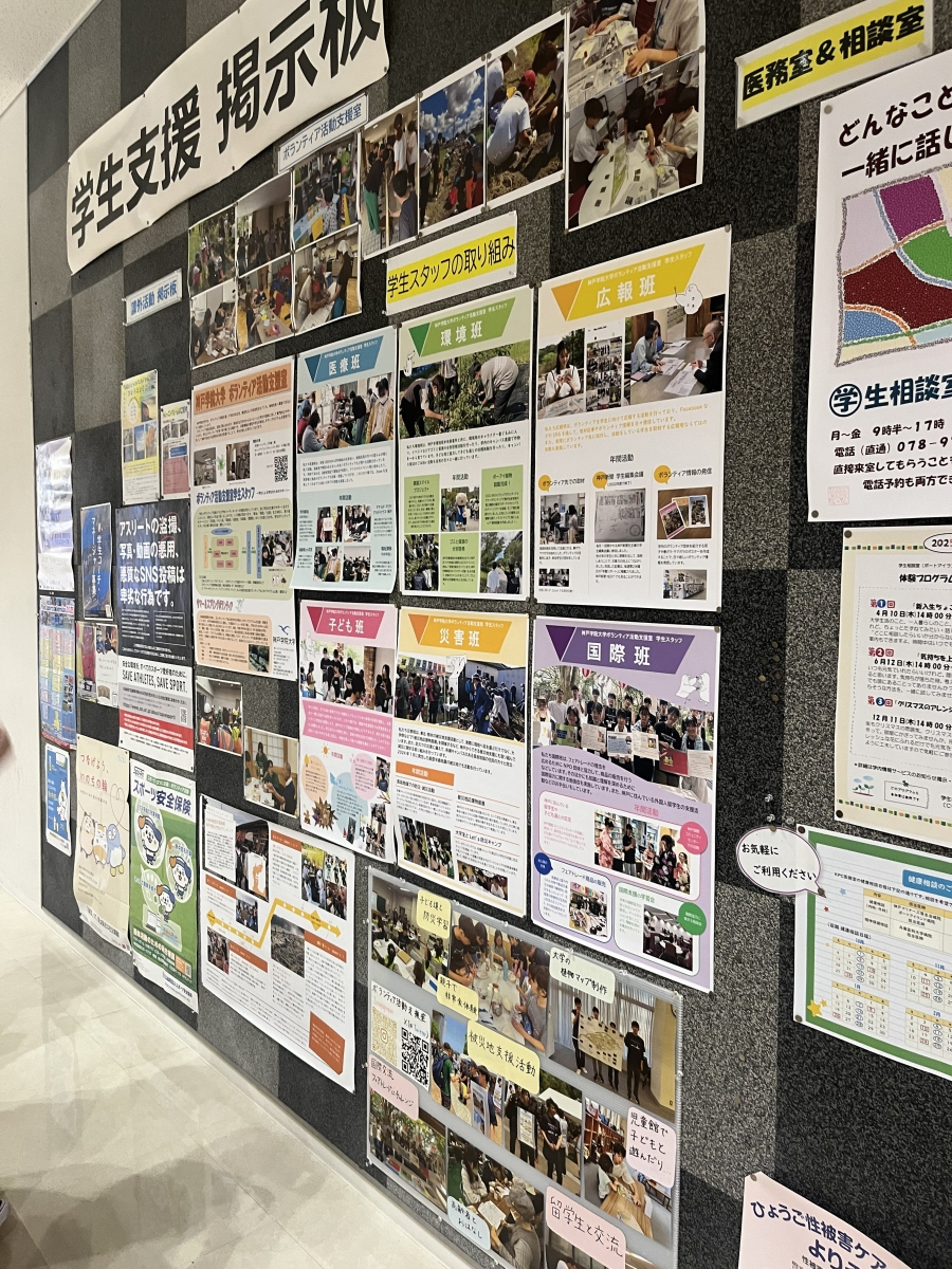 初めに、神戸学院大学ボランティア活動支援室を見学し、学内を巡りながらボランティアの広報活動などの説明を受けました。ボランティア活動支援室では、班別に所属している学生スタッフの自己紹介が貼り出してあったり、たくさんの画像と共にボランティア活動の様子が紹介されていました。また、支援室近くの廊下には多くのボランティア募集のチラシがラックに配架され、壁面にも多くの画像が貼り出されており、活動内容の様子がとても具体的に紹介されていました。