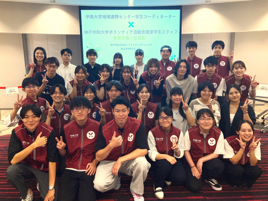 甲南大学地域連携センター学生コーディネーター「なんティア」では、2025年9月27日(土)に神戸学院大学ポートアイランドキャンパスにて、同大学ボランティア活動支援室の視察、および学生スタッフとの交流を行いました。この活動は、他大学の学生スタッフの活動や運営を学び、本学での活動の参考にするために実施しています。また、学生同士の交流を通じて、互いの学びとモチベーション向上につなげることを目的としています。当日は、本学の学生コーディネーター21名と職員1名、神戸学院大学の学生スタッフ10名と職員1名が参加しました。私たちは、昨年度制作した「なんティア」ユニフォームを着用して訪問しました。このユニフォームも、一昨年に他大学を視察したことがきっかけとなって制作したものです。