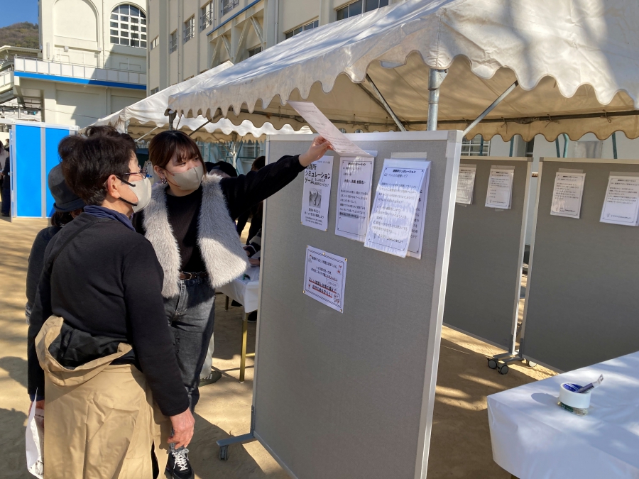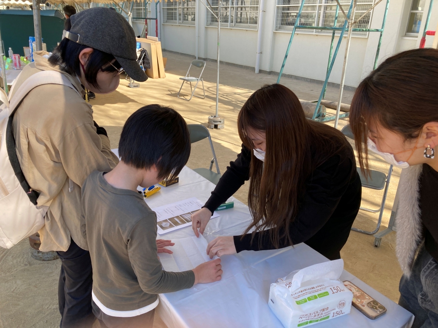 甲南大学では、避難所生活で過去に起こった困ったことのエピソードをもとに大学生がクイズを作成し、来場者に問題に挑戦していただきました。簡単な仕掛けですが、文字の大きさや問題と解答の示し方など、大学生が色々と話し合って作成しました。また、体験コーナーでは、簡易のマスクづくり体験を実施しました。これは、キッチンペーパー1~2枚、輪ゴム4本で簡単にマスクを作成するものです。当事者は小学生や中学生の参加者も多く、5分程度で作成できるため、多くの来場者に体験していただきました。ワークショップに参加した人からは「意外に簡単にできるものですね」との感想を得ました。発案者の甲南大学生は、「誰でも簡単に作成することができるので、ぜひ一度体験してみてほしい」と話していました。