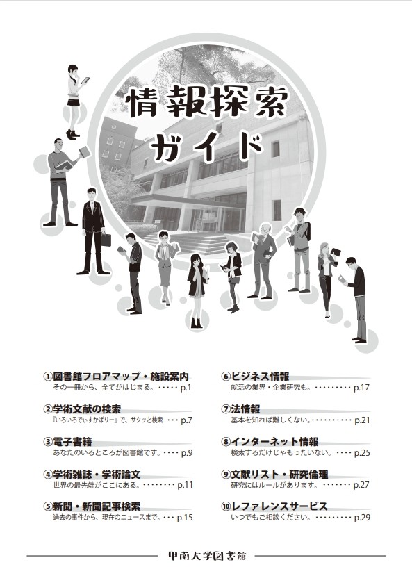 大学図書館には、本・雑誌・電子書籍・データベースなどたくさんの情報があります。情報探索ガイドは、大学図書館を最大限活用するための基礎知識を読みやすくまとめたものです。ぜひ楽しみながら読んでみてください!