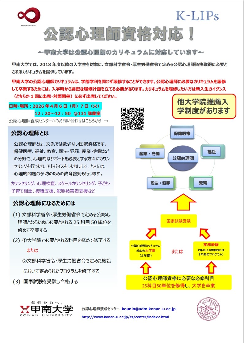 甲南大学は、すべての学部学科で公認心理師カリキュラムを履修することができる全国でも珍しい大学です。公認心理師(国家資格)に興味のある方は、新入生ガイダンス(4月6日・7日どちらか1回)に参加してください。