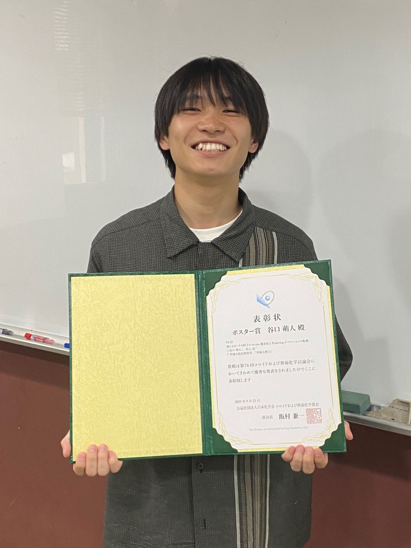自然科学研究科 化学専攻修士課程2年生の谷口萌人さんが、第76回コロイドおよび界面化学討論会(2025年9月22日~25日,千葉大学)において、「油によるシリカ粒子のin situ親水化とPickeringエマルションの転相」と題したポスター発表を行い、特に優れた発表を行った発表者に対し授与される「ポスター賞」を受賞しました。