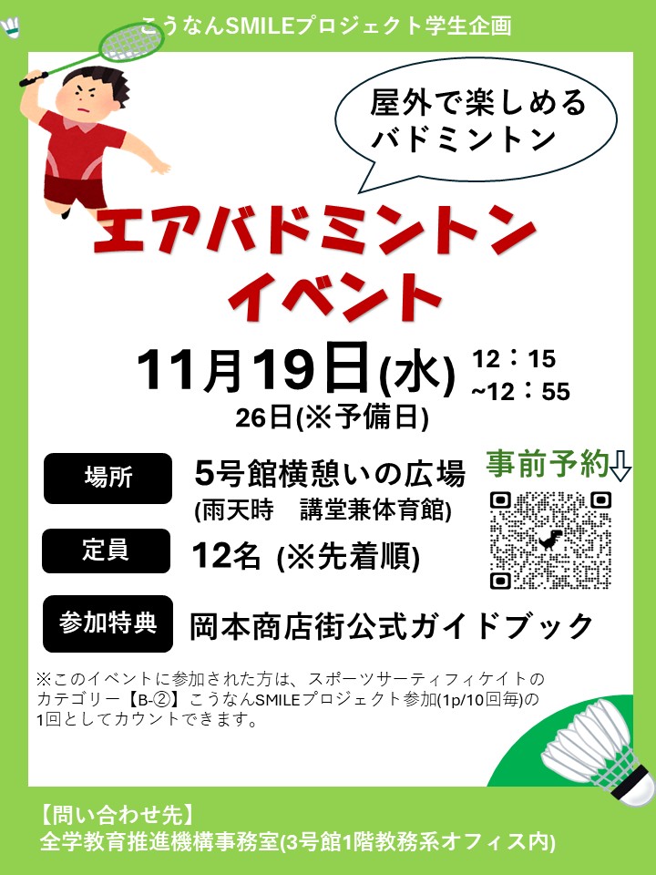 「こうなんSMILEプロジェクト」学生企画としてバドミントンを屋外で楽しむ「エアバドミントンイベント」を以下のとおり開催いたします。学生・留学生・教員のみなさんどなたでもご参加いただけます。