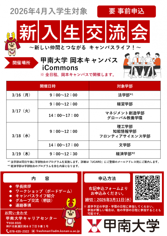 この春から甲南大学で学ぶみなさんを対象に、3月に新入生交流会を開催します。