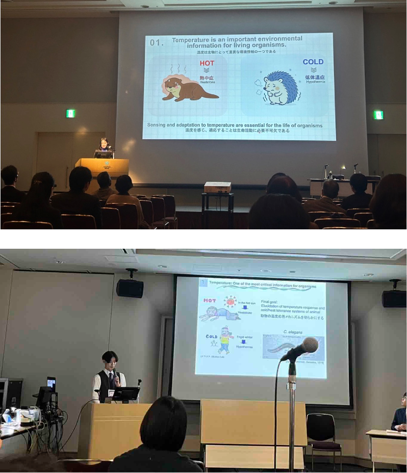 (2) 金村 菜々子さんは、公募シンポジウム「不均一性制御の定量生物学2025」にて、甲南大で見つかった3種類の温度受容体が温度感覚の多様性を生み出す研究を発表しました。